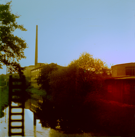der Fabrikeinfahrt links als bebaute Grenze zur Böschung zum Fluss